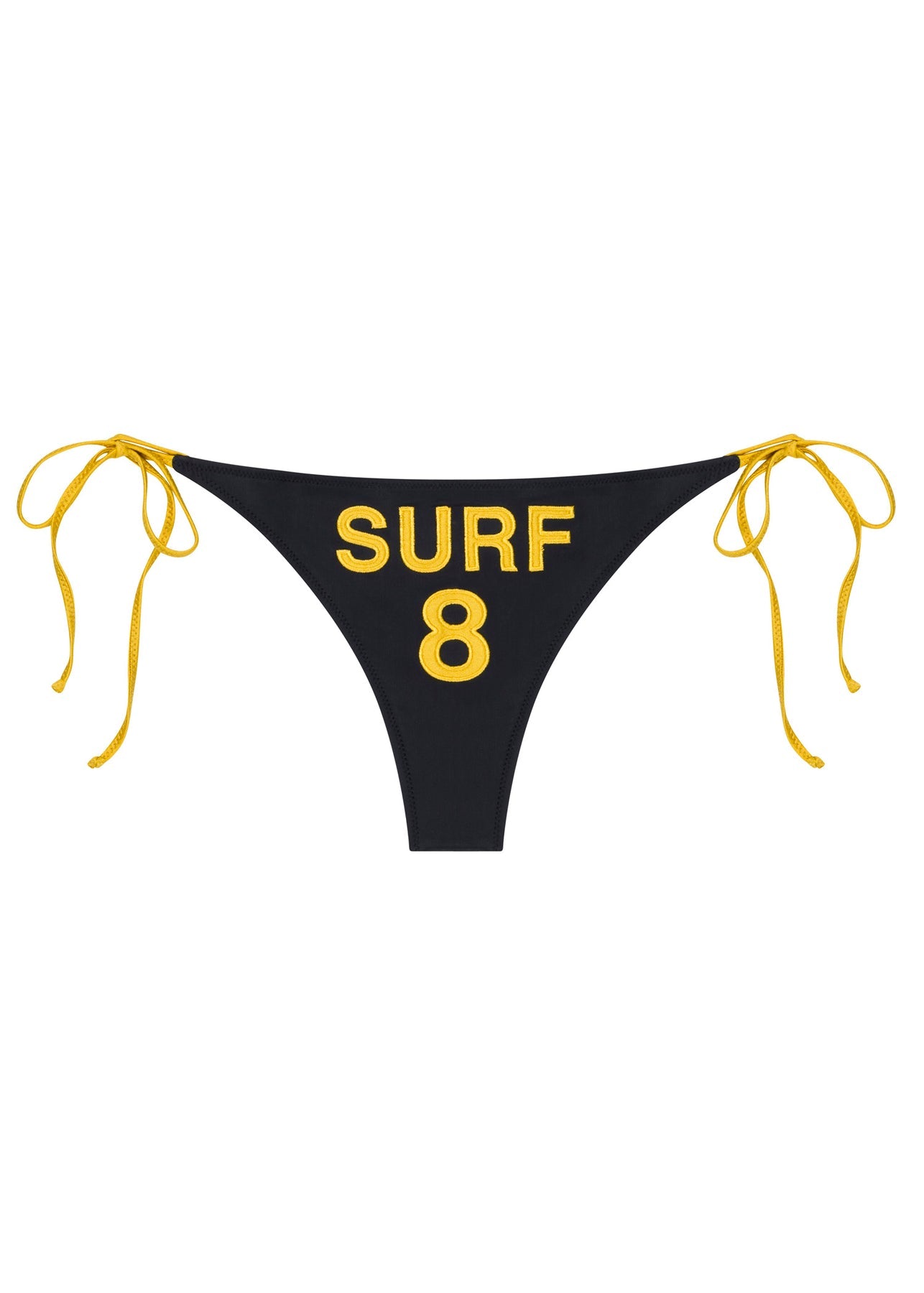 Bold and iconic, this suit is a timeless staple in black and gold, but what makes it stand out even more is it's vintage sports-inspired hand appliquéd "Surf 8" on the bottom. This classic string bikini bottom features a vintage-inspired zig zag stitch detail, incredibly soft fabric, and just the right amount of coverage ensuring you'll both look and feel your best.