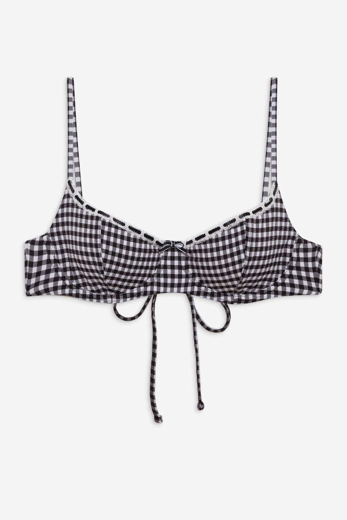 The Cola bikini top is designed to give you the lift you're looking for with adjustable shoulder straps and underwire support. This iteration of Cola features nautical stripes, ruffle trim, and a dainty bow detail.