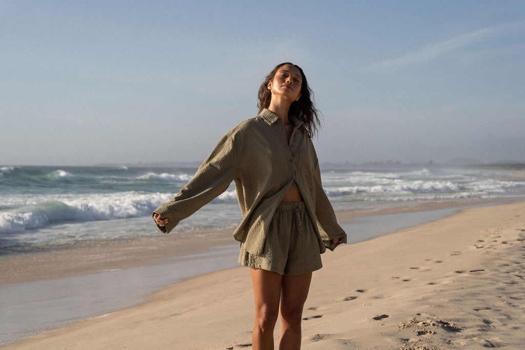 The Overswim Stripe Short in Olive is an airy, effortless piece crafted from seersucker stripe fabric. With an elastic waistband and side pockets, it's made for relaxed summer living.