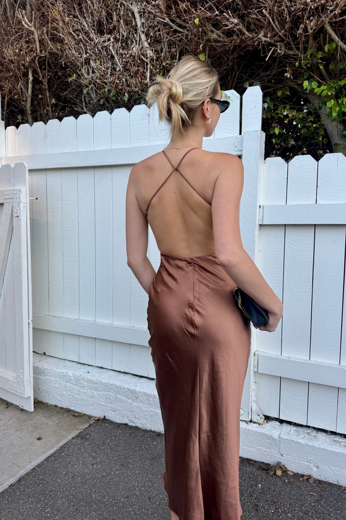 KEEN THE LABEL Montana Satin Cross-Back Maxi Dress