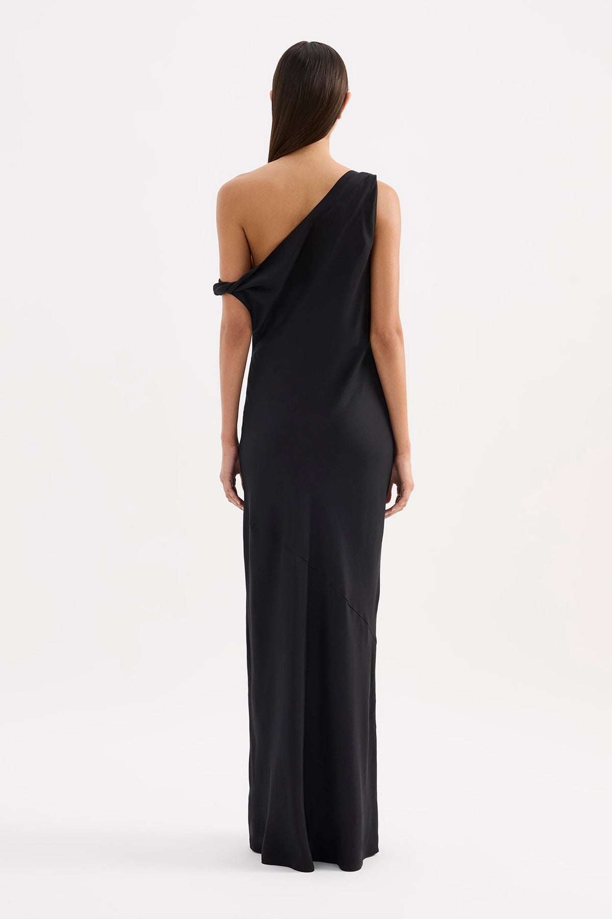 The Calista Tencel Dress is made from a Tencel blend fabrication which is lightweight and has a smooth, drapey hand feel. Cut on the bias, this silhouette drapes over the body softly and finishes at the ankles. Features include an asymmetrical, off the shoulder neckline with twist strap detail.