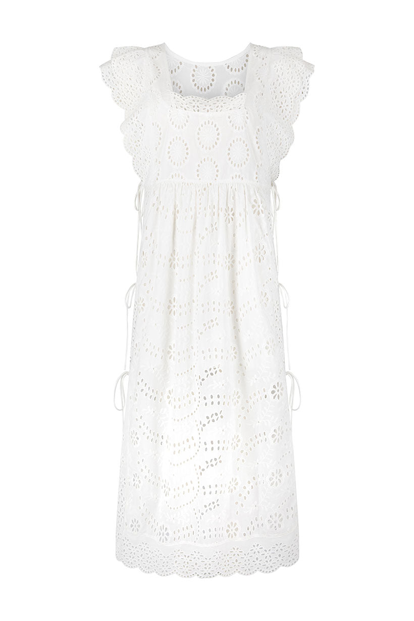 The Yaya Lace Kaftan in Vintage White brings effortless charm with its delicate scallop lace and broderie anglaise detailing. Crafted from 100% organic cotton with a soft slip lining, it offers lightweight comfort and breathability. The playful square front neck, side ties, and flattering scalloped hems add a whimsical touch, perfect for lounging or sunny adventures.