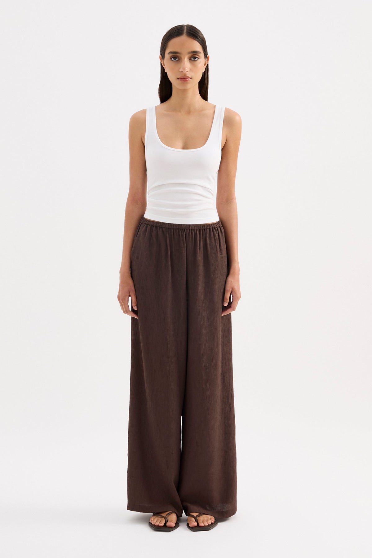 The Winfield Pant is made from a crinkle textured fabric which has a dry, lightweight hand feel. The silhouette is relaxed with a wide full length leg. Features include an elasticated waistband and side seam pockets.