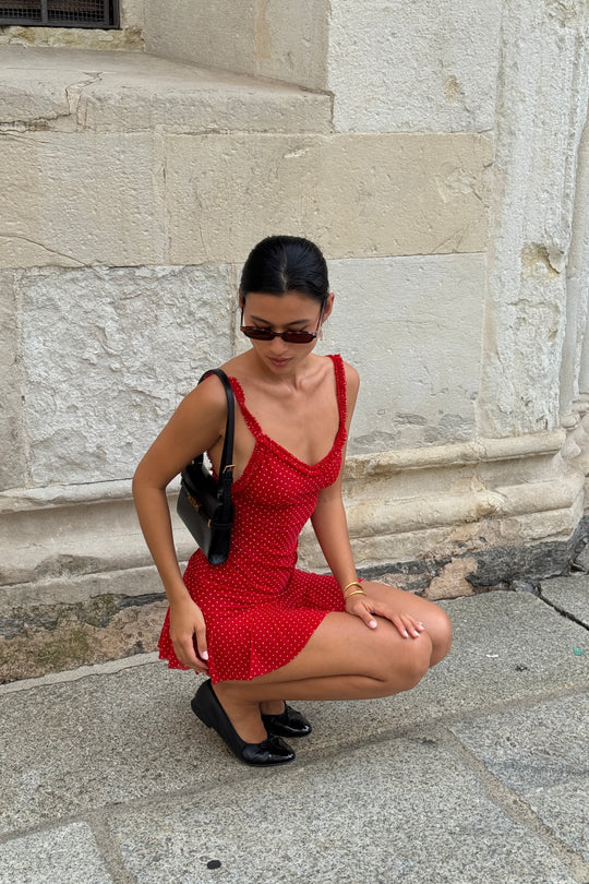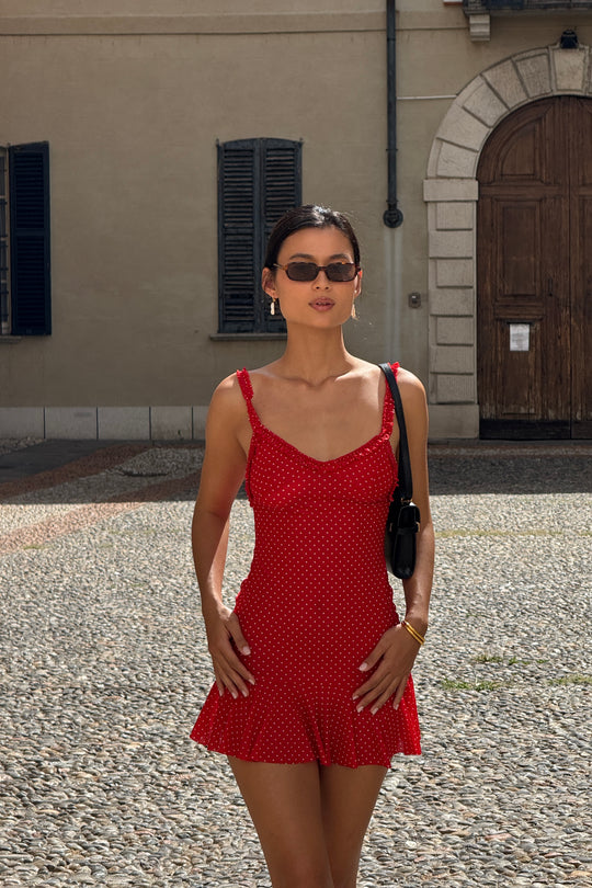 The Camilla in Minnie. Blending playful ruffles and romantic charm, the Camilla mini dress is a sweet 'n sultry combo. Semi-sheer coverage with double lining in the bust. Made from Italian mesh soul eco. Aisha wears size S. Jenny wears size S. Rachelle wears size S. Fit runs small, we recommend sizing up if in doubt (and for extra length).