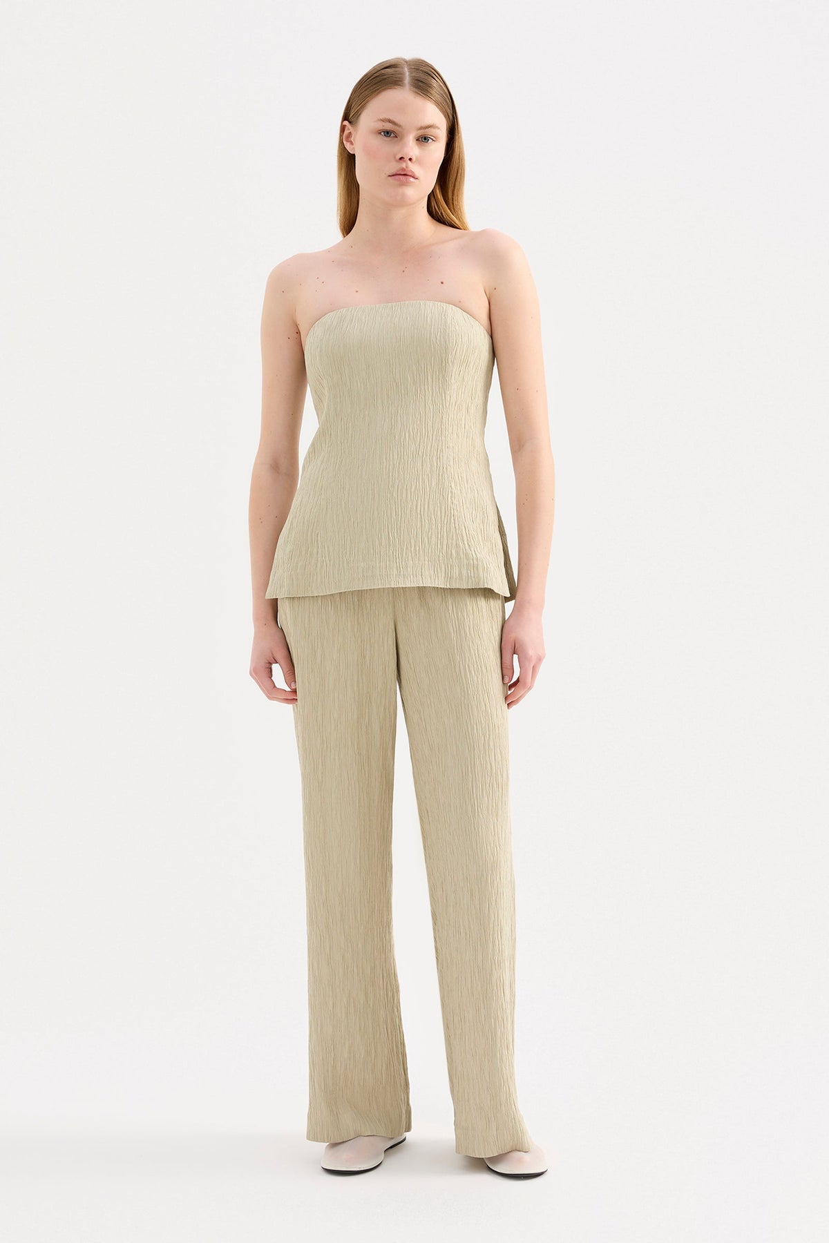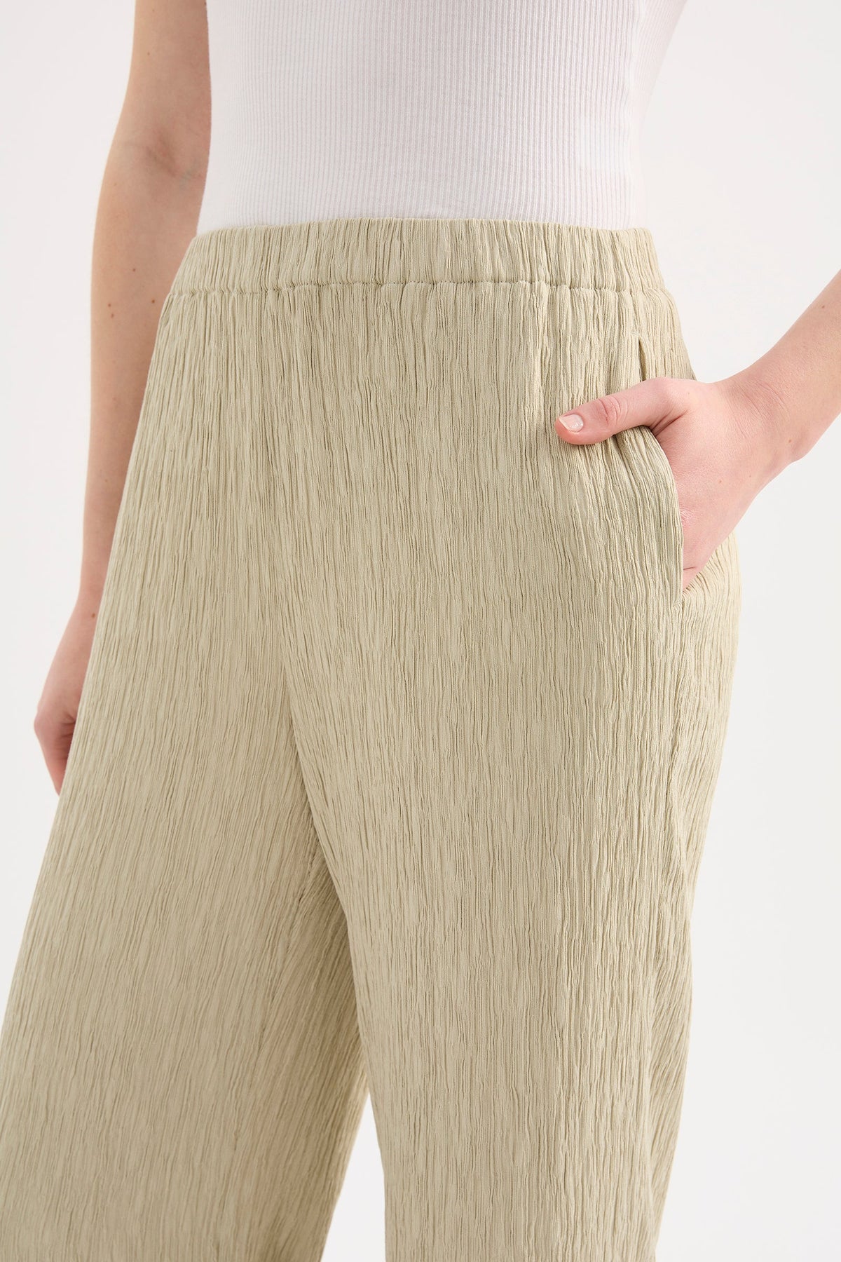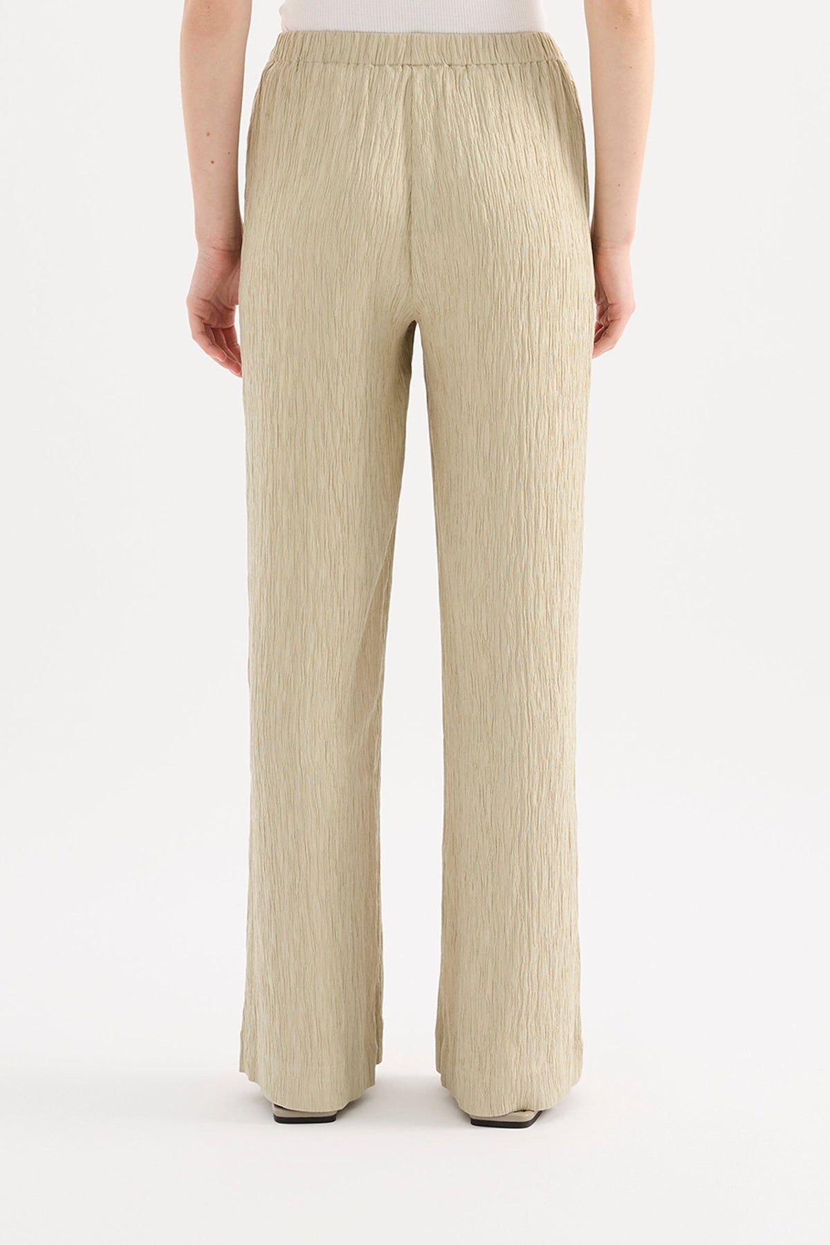 The Danika Pant is made from a crinkle textured fabric which has a dry, lightweight hand feel. The silhouette is relaxed with a straight, full length leg. Features include an elasticated waistband and side seam pockets.