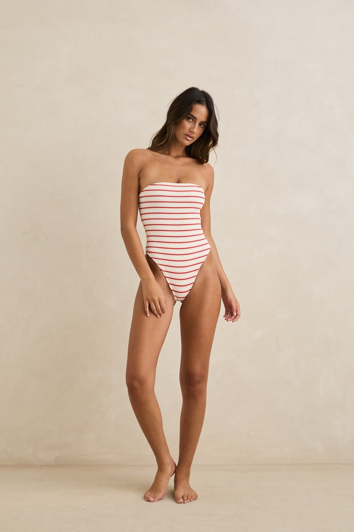 Chic and effortless, the Tami Stripe Strapless One Piece features a strapless neckline with internal silicone grip, a low scooped back, and a high-cut leg. Perfect for sun-drenched days by the coast.