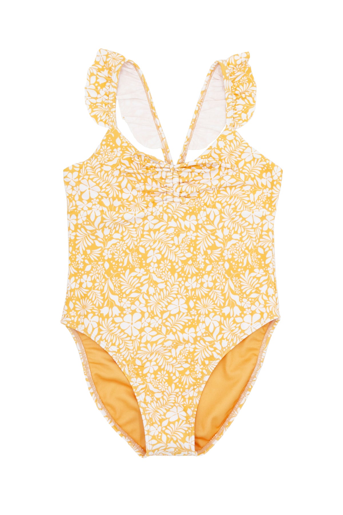- One piece swimsuit with cute ruched tie detail at neck, ruffle strap and contrast liner.
