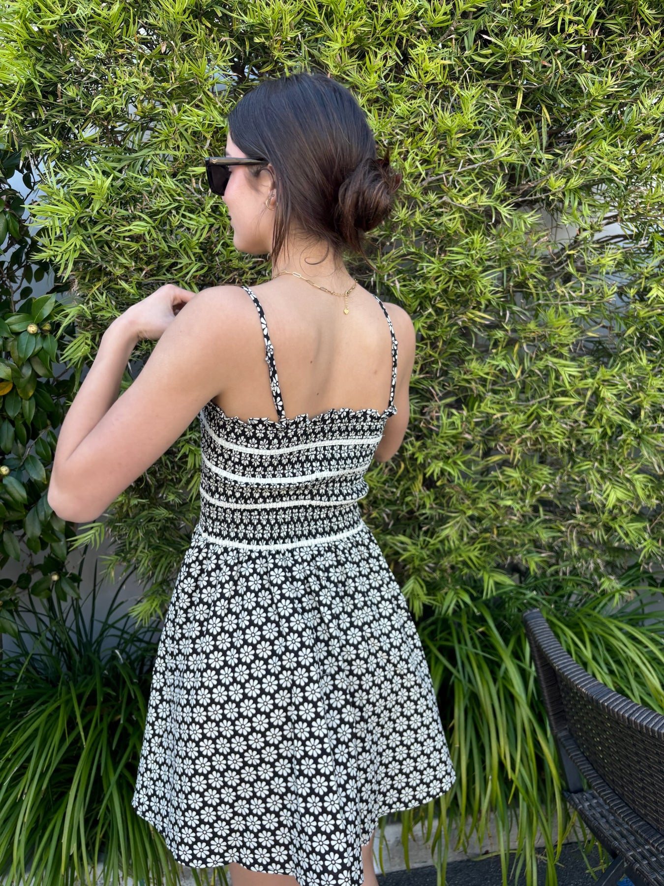 The Birdies is a floral print mini dress with smocked bodice and piping details.
