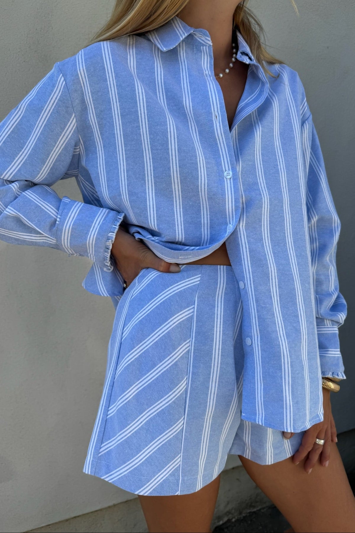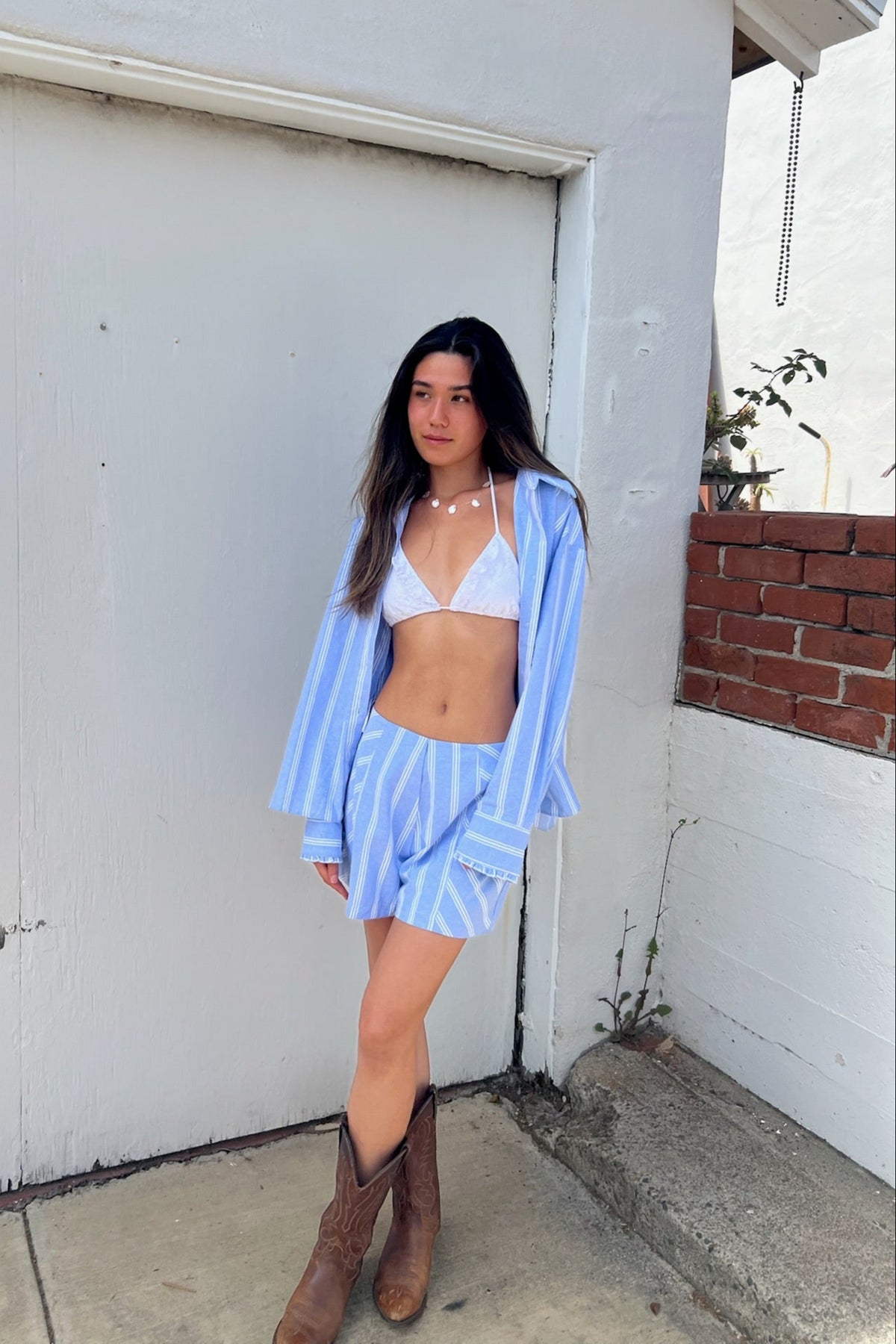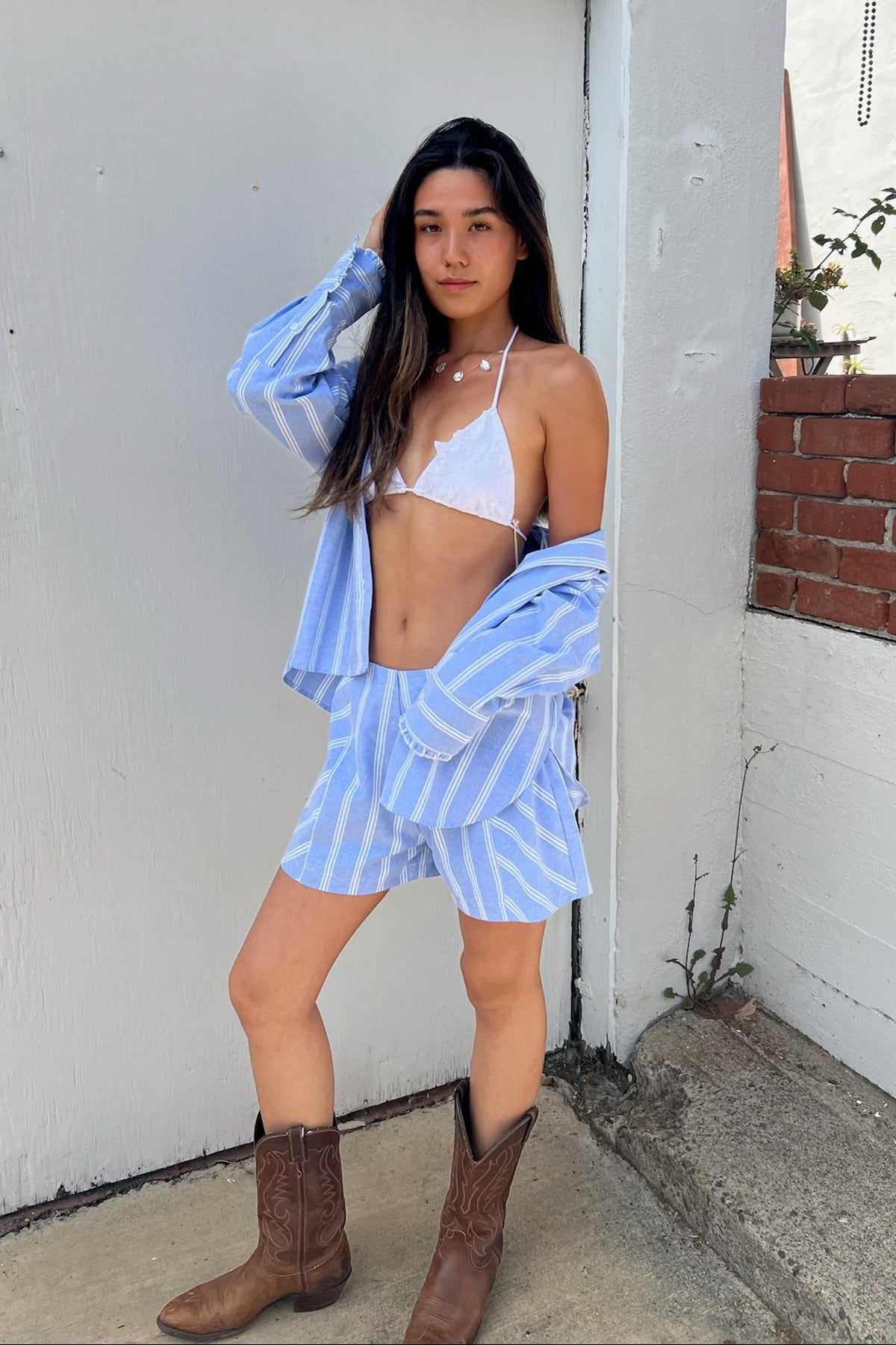 The Marlowe is a tailored-fit stripe short. Zippered side.