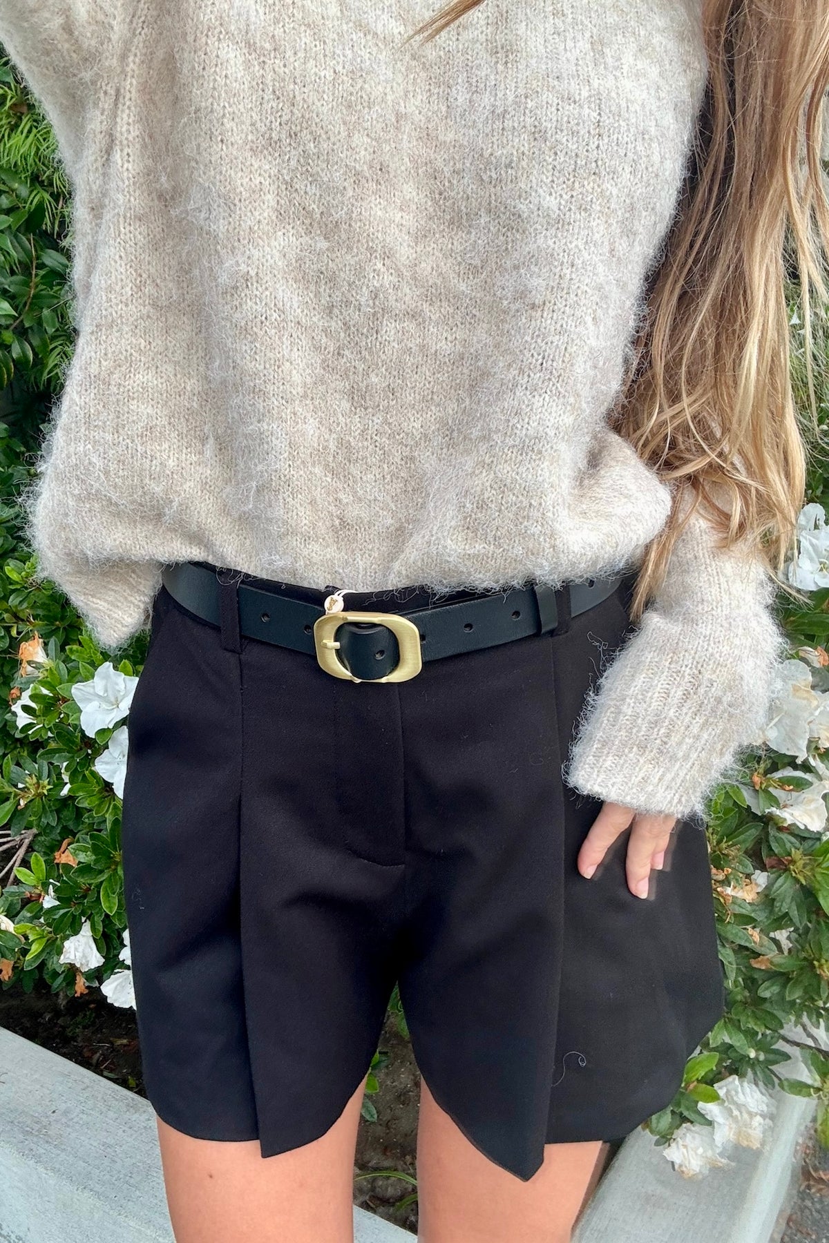 These stylish black shorts are a wardrobe staple, easily transitioning from day to evening. Featuring a high-waisted fit and classic front pleats, they offer a flattering and structured silhouette. The tailored design and breathable fabric provide all-day comfort with a polished look. Pair them with a cozy sweater for a transitional season look, or dress them up with a blouse and heels.