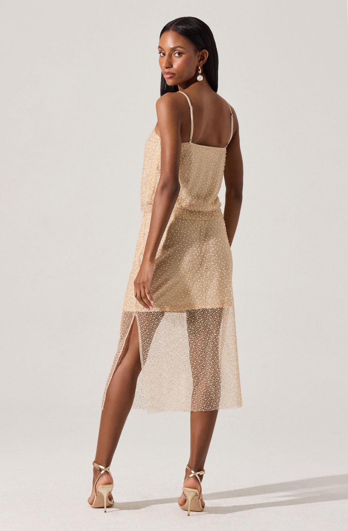 Embellished with delicate pearls and beading, this skirt features a mesh overlay for a daring yet chic night-out look. Perfect for special occasions, especially holiday parties, when paired with its matching top.