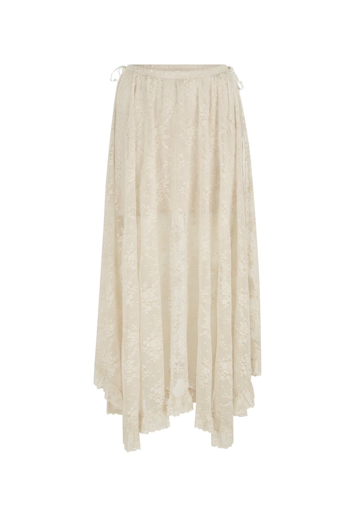 The Labyrinth Lace Maxi Skirt in Cloud Cream is an effortless statement piece that is ethereal and beautiful. Crafted from 90% recycled polyamide with a touch of elastane, this maxi flows with graceful movement while the delicate lace hem trim adds intricate detail. The elastic waist and adjustable side tie offer flattering versatility, whether worn at the waist or hips, while the hi-lo hem creates a playful, dynamic silhouette. Slip lining ensures comfort and confidence with every step.