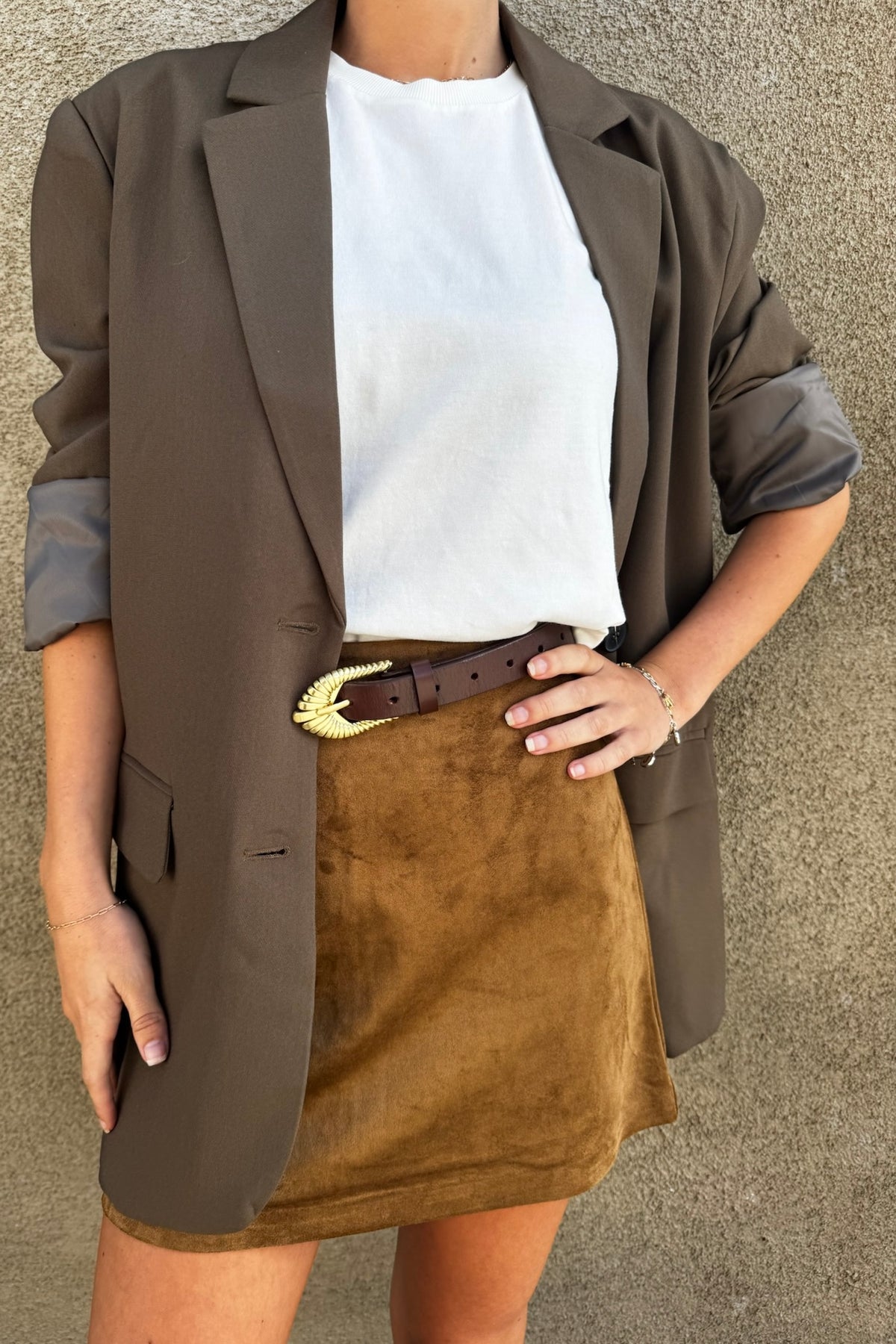 This versatile brown blazer is an essential piece for any wardrobe. Its relaxed fit and classic design make it easy to dress up or down, while the cuffed sleeves with a contrasting lining add a stylish touch. It pairs perfectly with anything from a simple t-shirt and jeans to a skirt and blouse for a more polished look.