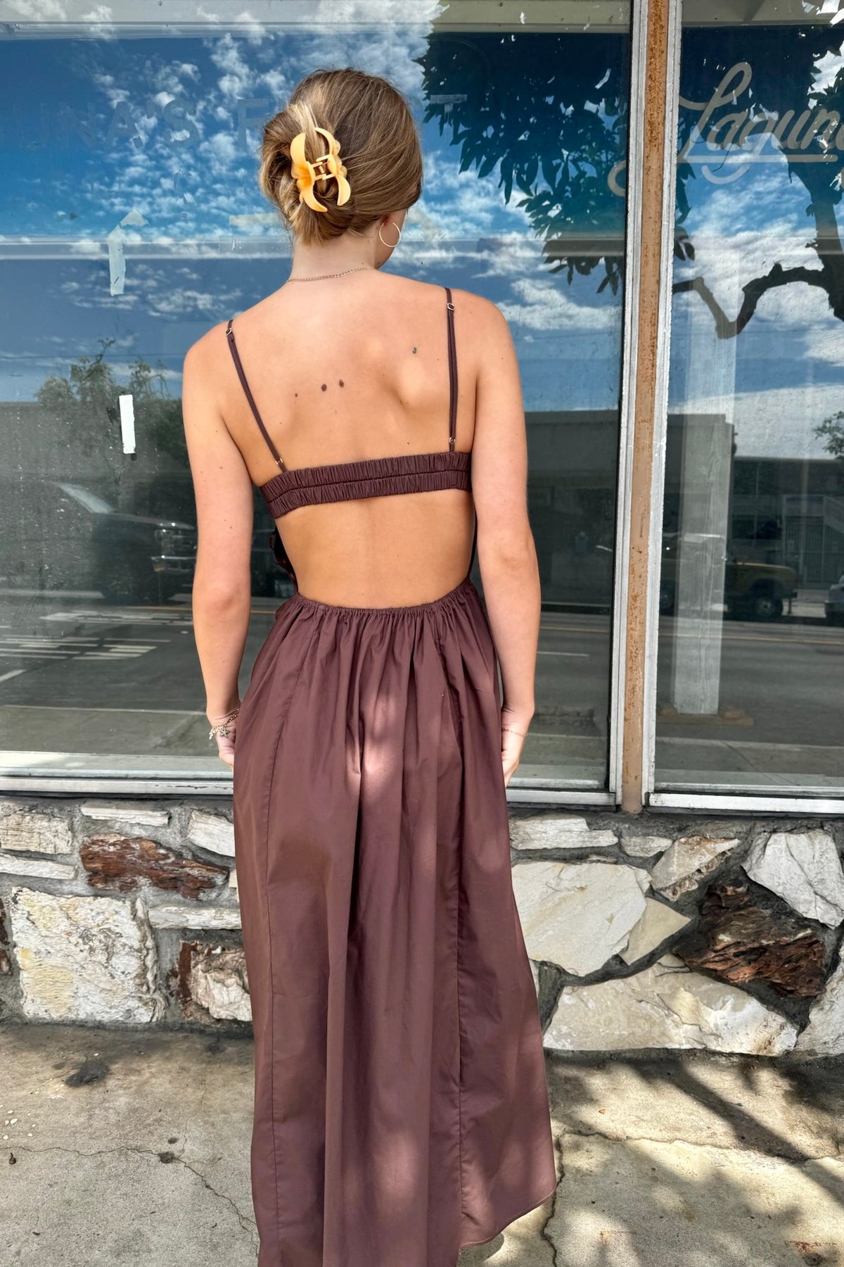 This elegant brown midi dress features a flattering twisted bust and delicate spaghetti straps. A dramatic open back with a smocked panel and side cutouts at the waist ensures a comfortable and perfect fit. The voluminous skirt adds graceful movement with every step.