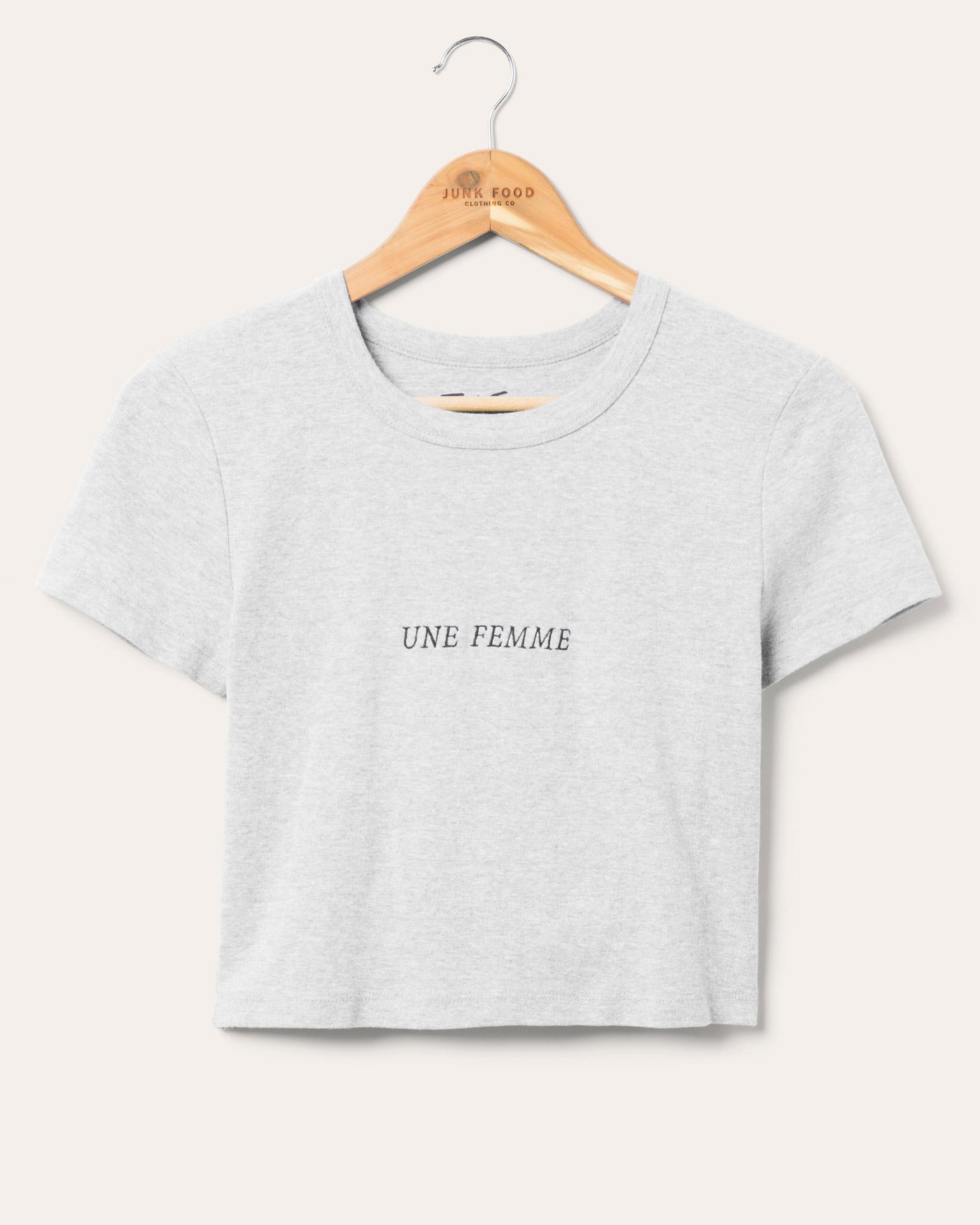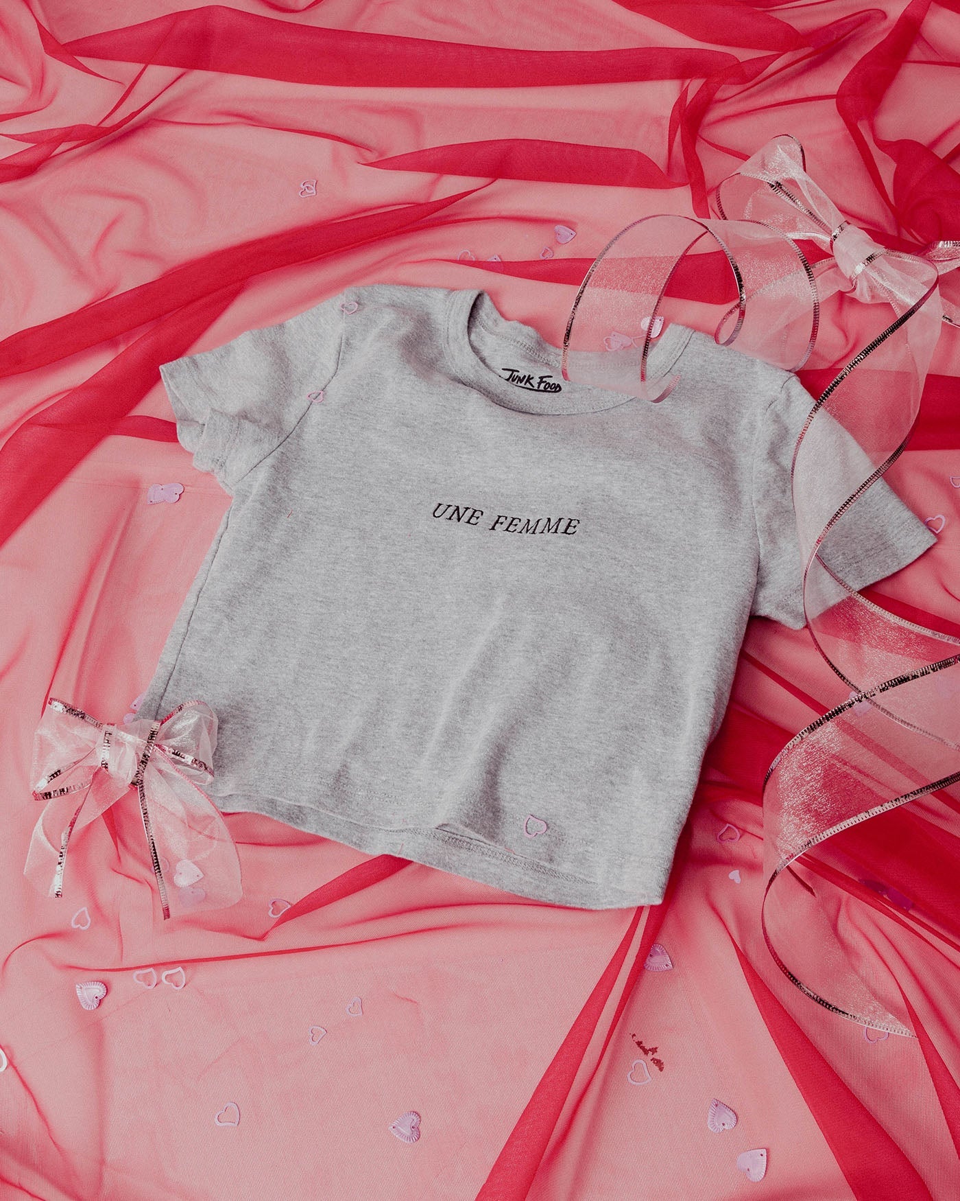 Effortlessly cool with a French-girl edge—the Une Femme Baby Tee is your new everyday essential. With a flattering fitted cut and minimalist design, it’s perfect for layering or making a statement on its own. Simple, chic, and undeniably femme.