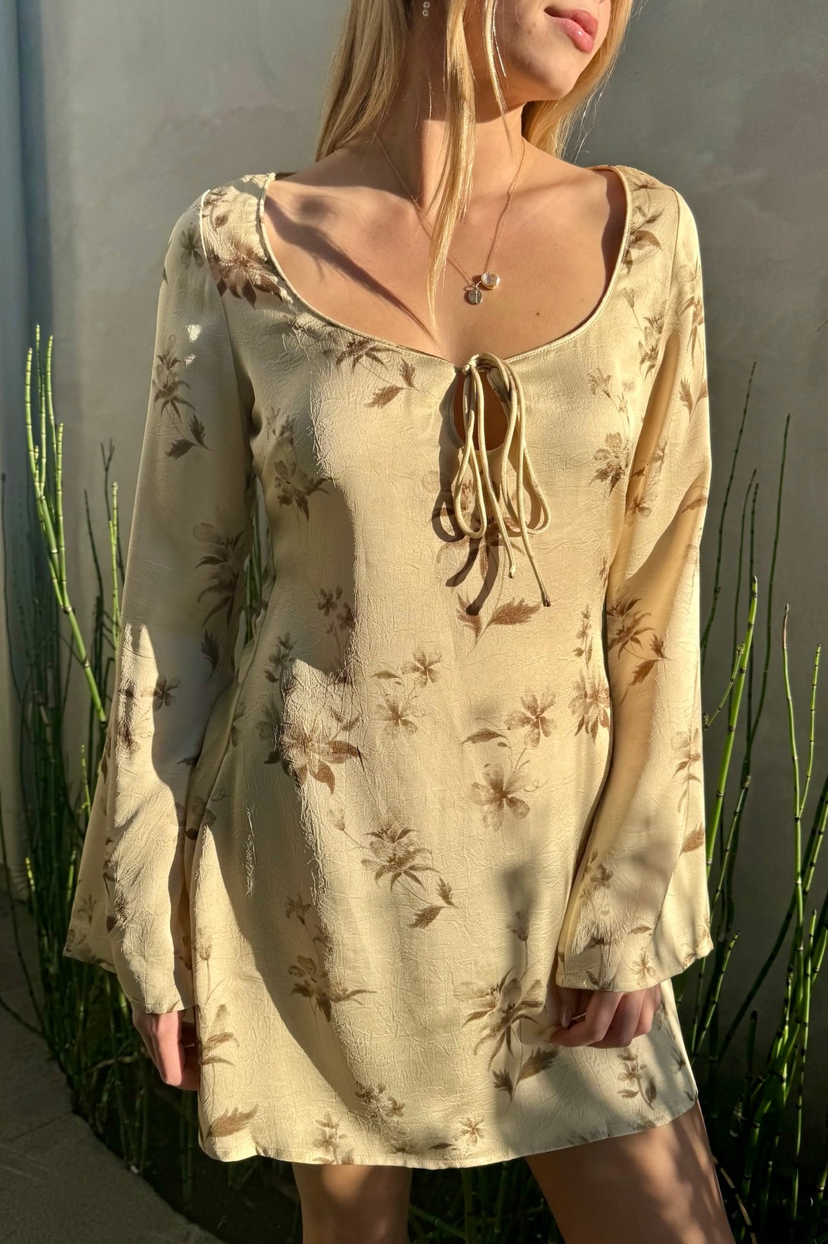 Embrace effortless charm with this beautiful mini dress, perfect for a sunny day out or a casual evening event. The soft, flowy fabric features a delicate floral print, and the feminine scoop neck with a tie detail adds a touch of bohemian flair. The bell sleeves complete the chic, relaxed silhouette.