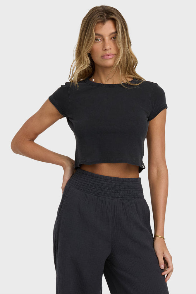 Slip into the Daily, a knit top crafted with 87% cotton and 13% partially recycled cotton jersey. With a specialty dye, rib bindings, and metal plate, this top puts 'effortless' in style.